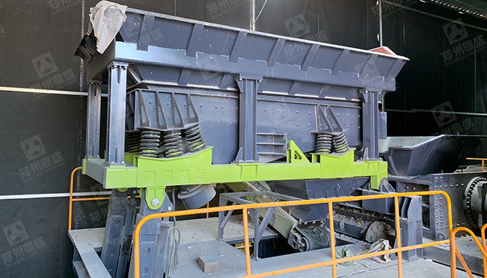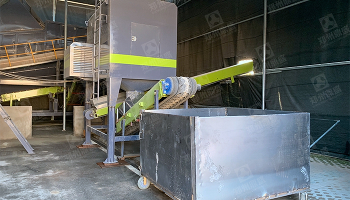混合料經過輸送機輸送至複合階梯篩,複合階梯篩(shāi)上層為指形棒條,按階梯(tī)排布,不易堵塞,上(shàng)層篩分出混(hún)合(hé)料中的大粒(lì)徑物料,≤50mm以下物料進入二層篩網,二層篩網為聚氨酯篩網,具有弛張收縮能(néng)力,不會堵塞網孔,≤15mm渣土及細骨料(liào)通過篩離(lí),通過成品輸送機輸送(sòng)至成品料(liào)庫,>15mm以上物(wù)料隨(suí)上層篩分出的大粒(lì)徑物料混合進入下一級輕重分離模塊;在此單元中,設定有氣箱脈衝袋式除塵(chén)器,對粉塵進(jìn)行收集,保證複合階梯篩篩分中工況(kuàng)條件。