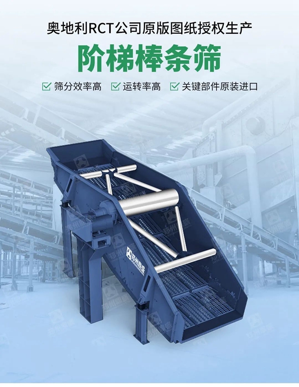 階(jiē)梯棒條篩(shāi)上層篩網采用懸臂棒條形式不僅(jǐn)有利於大小物料快速分層,同時可(kě)以有效緩解物料堵塞情況,而且二次振動還能給(gěi)上層大粒徑物料一個更大的加速度有利於大粒徑物料以(yǐ)更快的(de)速度離開篩麵,減輕篩分壓力、提(tí)高篩子產量。上(shàng)層棒條篩在一定程度上還能夠減輕塑(sù)料袋、布條對於篩分娩的堵(dǔ)塞,更(gèng)加有利於設備篩(shāi)分作業。