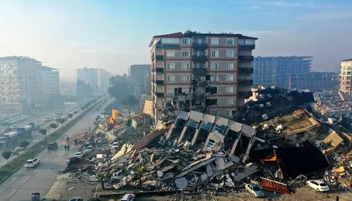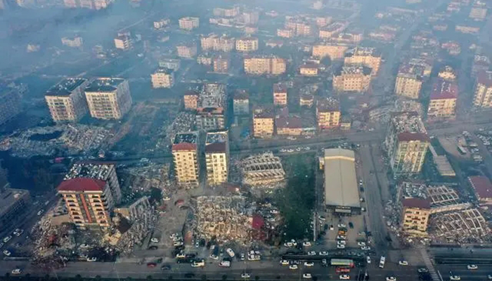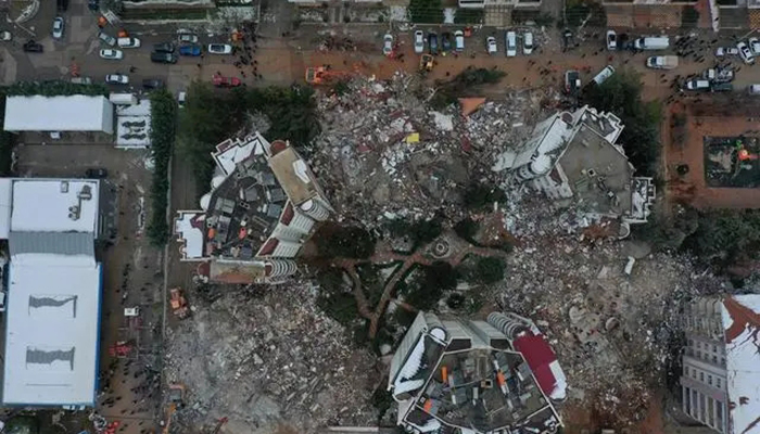 當地時間2023年2月(yuè)6日,土耳其馬拉提亞,俯瞰倒塌建築的殘骸(hái)。