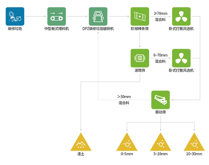 從圖中可以看到主要用到的設備有:中型板式喂料機、DPZ裝修垃(lā)圾破碎機、階梯棒條篩(shāi)、臥式打散風選(xuǎn)機、滾筒篩等裝備。如果您想建一(yī)條垃圾分(fèn)揀生(shēng)產線,又不想投入太多,那麽可以選擇無人工(gōng)垃圾分(fèn)揀生產線。