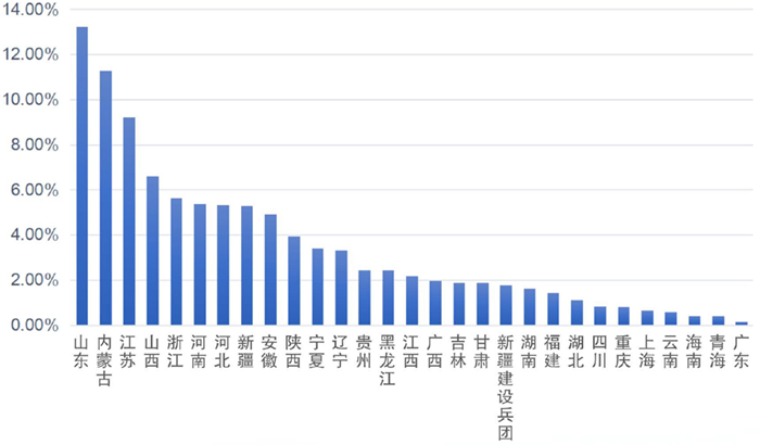 碳(tàn)排放配額是國家分配給重點排放單位的規定時期內的(de)碳排放額度生態環境部根據國家溫室氣(qì)體排放(fàng)控製要求,製定碳排放配額總量確(què)定與分配方案,2020年12月,生態環境部印發《2019-2020年全(quán)國碳排放權交易配額總量設定與分配實(shí)施方案(發電(diàn)行業)》。第一個履約周期采用基於(yú)碳排放強度控(kòng)製目標的行業基準法,核算重點排放單位擁有各類機組(zǔ)的配額數量,加總確定全國配額總量,通過預分配和核定分配(pèi)兩個階段全(quán)部免費發放。全國碳市場第(dì)一個履(lǚ)約周期配額(é)分配量最(zuì)大的地區是山東、內蒙(méng)古、江蘇,配額總量占全國33.71%(如(rú)圖4所示)。300MW等級(jí)以上常規燃(rán)煤機組、300MW等級及以下常規燃(rán)煤機組、非常規燃煤機組(zǔ)、燃氣機組分配配額(é)量分別占總配額量的32.4%、48.3%、18.4%、0.9%。