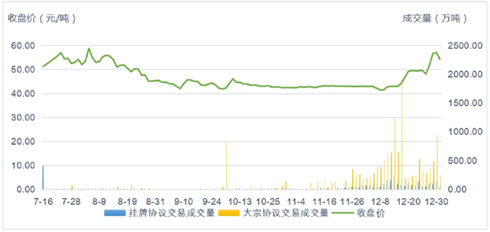 全國碳市場第一個履約周期納入的重點排放單位為發電行業(含其他行業自備電廠)2013-2019年任一年排(pái)放達到2.6萬(wàn)噸二氧化碳當量(綜合能源消費量約1萬噸標準煤)及以上的企業或者其(qí)他經濟(jì)組織,共2162家重點排放單(dān)位,年度覆蓋二氧化(huà)碳(tàn)排放(fàng)量(liàng)約(yuē)45億噸,是全球覆蓋排放量規模最大的碳市(shì)場。截至2021年12月31日(rì),第一個履約周期共運行114個交易日,碳排(pái)放配額累計成交量1.79億噸,累計成交金額76.61億元,成交均(jun1)價42.85元/噸(dūn),每日收盤價在40~60元/噸之間波動,價格總體穩中有升(如圖1所示)。