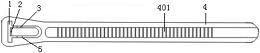 2、產品特點:本實(shí)用新型公開了一種可鬆(sōng)式(shì)紮線帶,帶身表麵(miàn)設置卡槽,卡(kǎ)槽呈條形(xíng)均勻排列(liè);帶身一端連接帶頭;帶頭上設置(zhì)帶孔,帶孔內側設置卡扣,卡扣的長度小於卡槽的(de)長度;帶孔一側設(shè)置壓塊,壓塊與(yǔ)帶孔垂(chuí)直設置;壓塊上設置銷孔,銷孔設置銷,銷孔與銷同圓心且(qiě)銷孔直徑大於銷的直(zhí)徑(jìng);壓塊上還設置凸起;本可(kě)鬆式紮線帶,采用卡槽,槽(cáo)口,壓塊和銷設計,捆紮電線牢固,可緊可鬆,自由靈活(huó),可重複使用,節省(shěng)材料(liào);本可鬆式紮(zhā)線帶,材質采用(yòng)UL認可的(de)尼龍66材料,尼龍66材料抗張(zhāng)強(qiáng)度(dù)高,耐磨,電絕緣性好,經久耐(nài)用。
