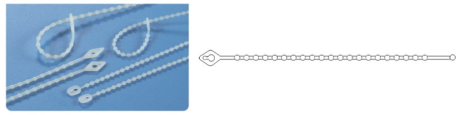 材質:UL合格之NYLON66(本色),防火等級94V-2. 用途:一般電源線(xiàn)之綁紮,可再鬆開重複使用。 Material:Nylon 66 certificated by UL. Usage:Beaded design keeps wires from shifting of slipping
